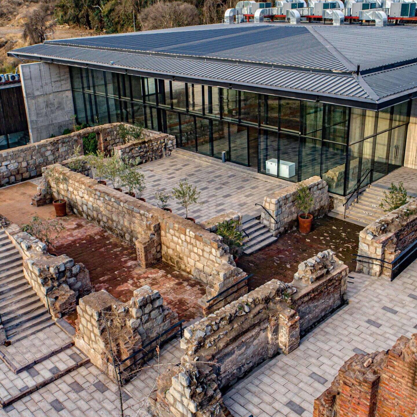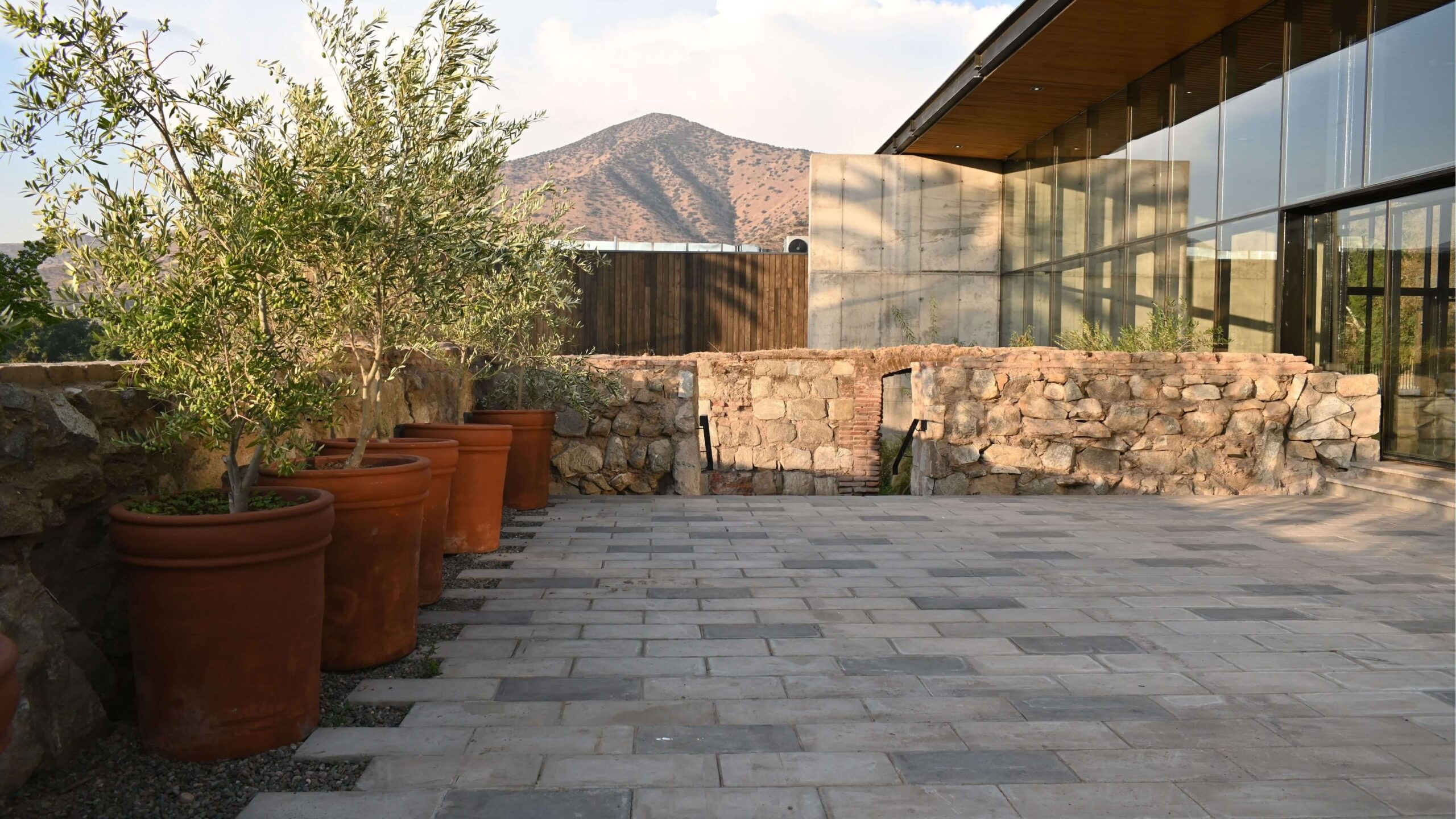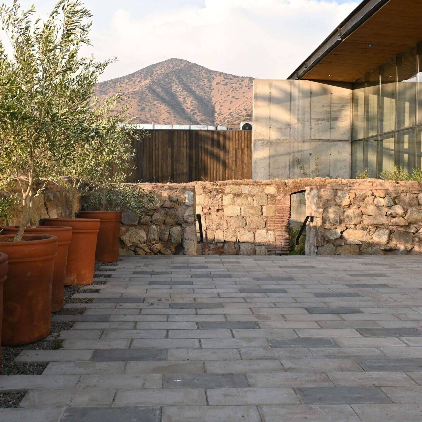 Espacios exteriores aterrazados con accesos al salón principal. Conectadas a través de escalinatas y rampas con accesibilidad universal que circulan por medio de las ruinas. Terrazas aptas para cocktail, brindis y bienvenida de los novios. Existe un espacio para celebrar ceremonias y se pueden incluir barras al aire libre.