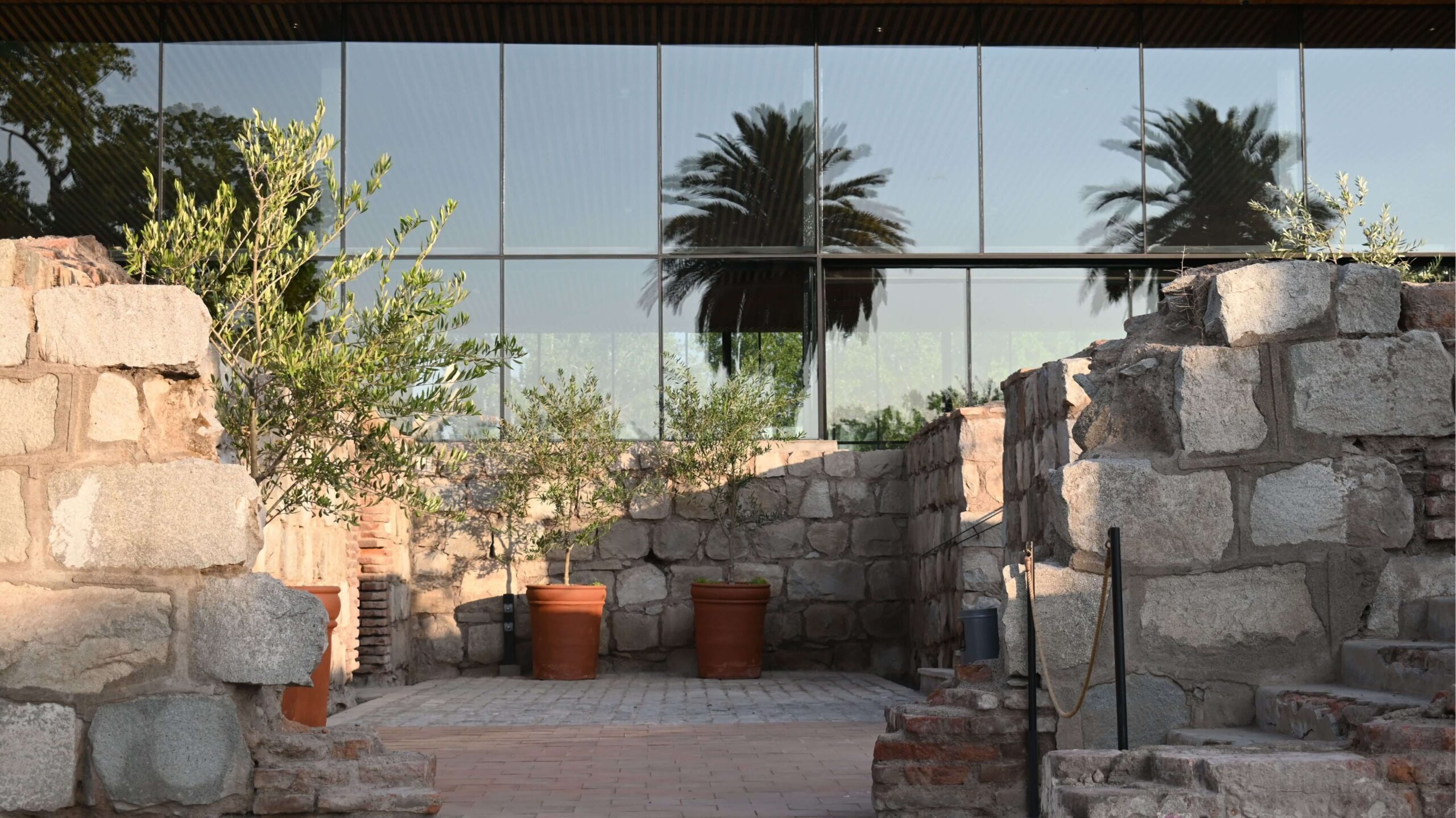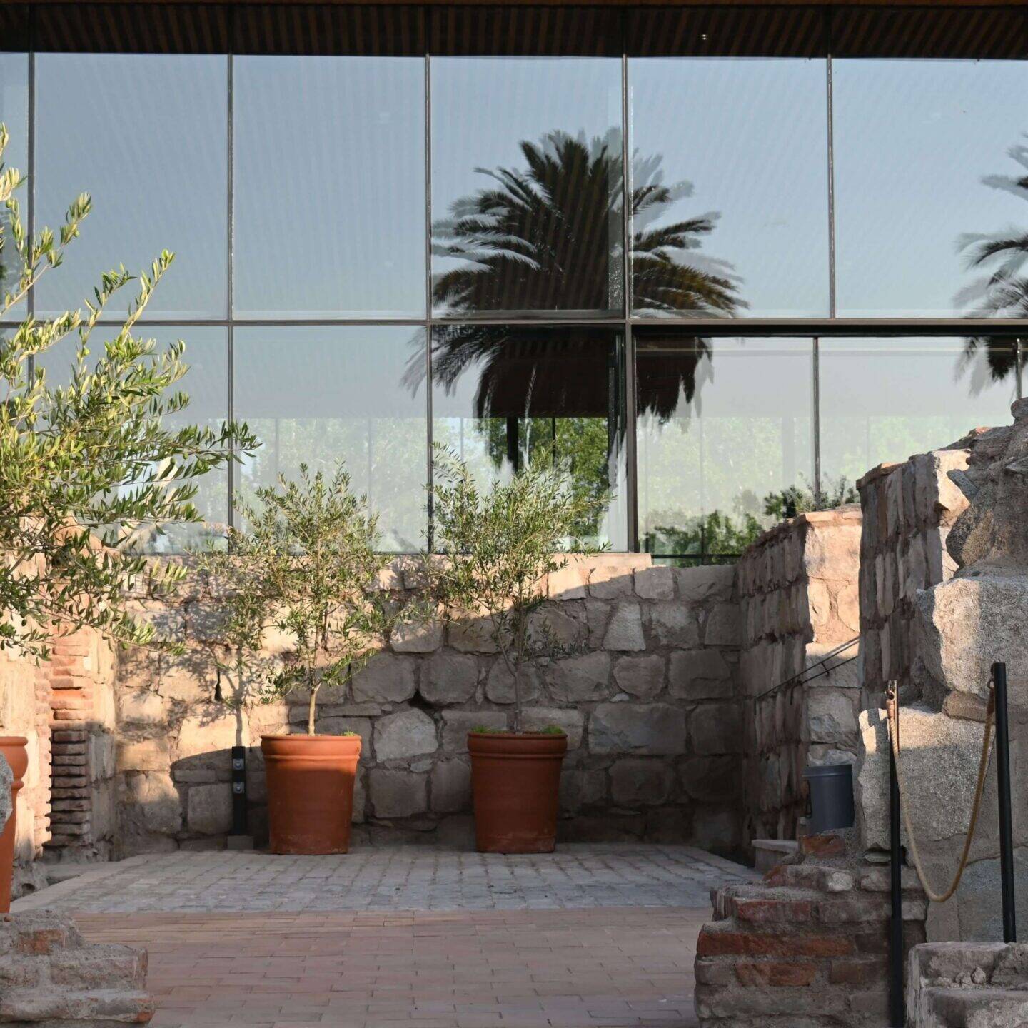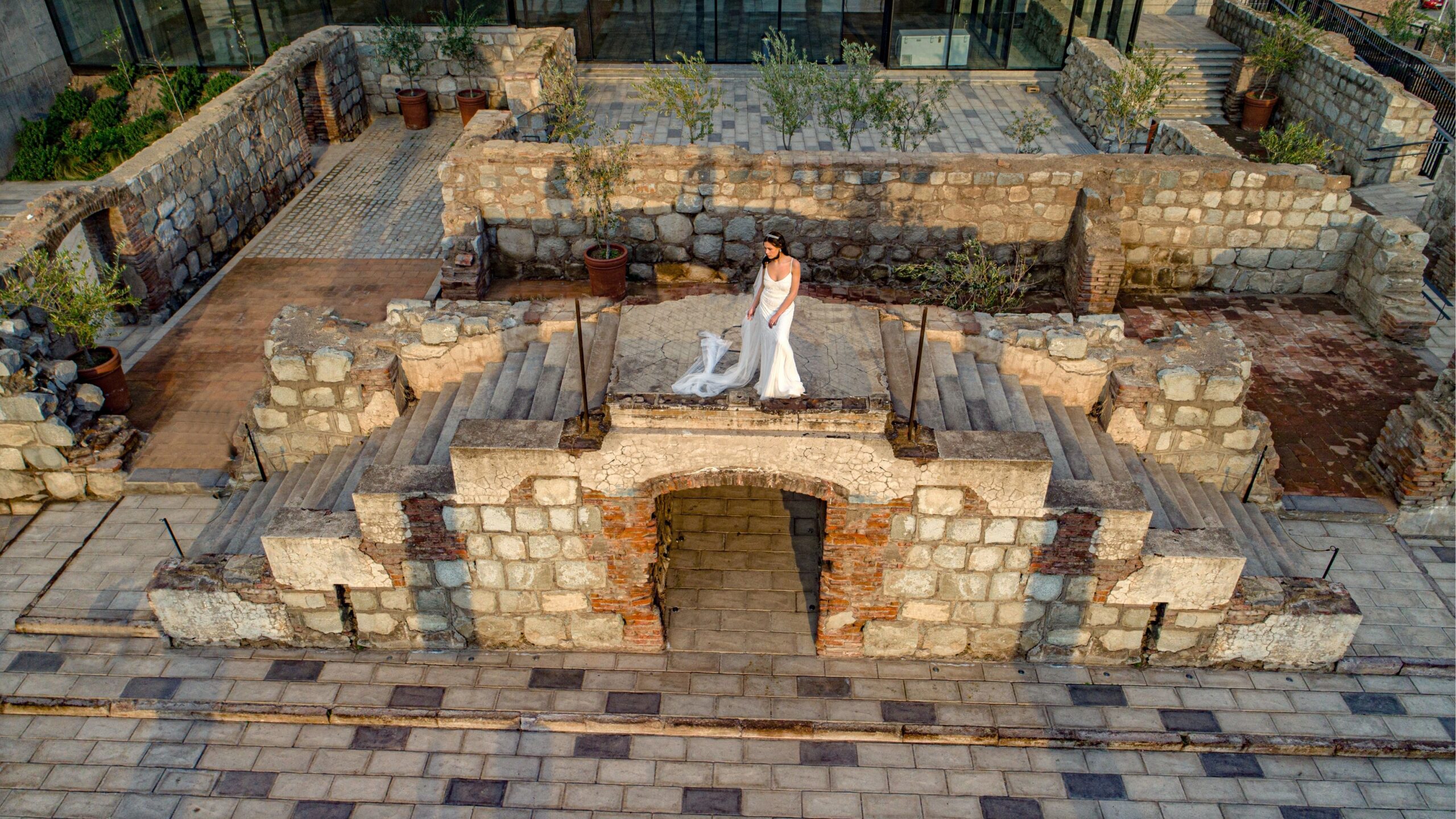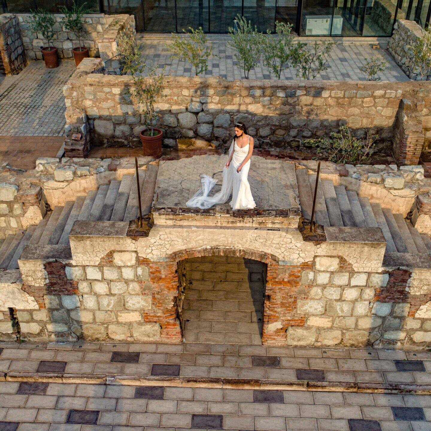 Espacios exteriores aterrazados con accesos al salón principal. Conectadas a través de escalinatas y rampas con accesibilidad universal que circulan por medio de las ruinas. Terrazas aptas para cocktail, brindis y bienvenida de los novios. Existe un espacio para celebrar ceremonias y se pueden incluir barras al aire libre.